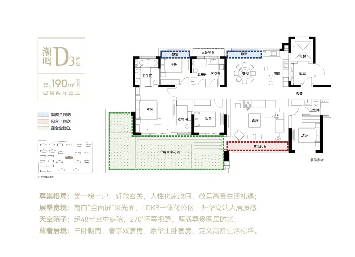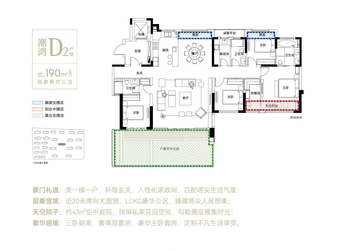 领创之作:襄阳绿城第四代住宅实际得房率超111%,在襄阳第四代住宅市场上处于领先地位;最高赠送约80方空中花园。(建筑面积约190平米高层顶层户型),实现墅式庭院生活梦想。约1.5容积率低密住区、约1.5低容积率,襄阳少有,打造臻稀低密住区。